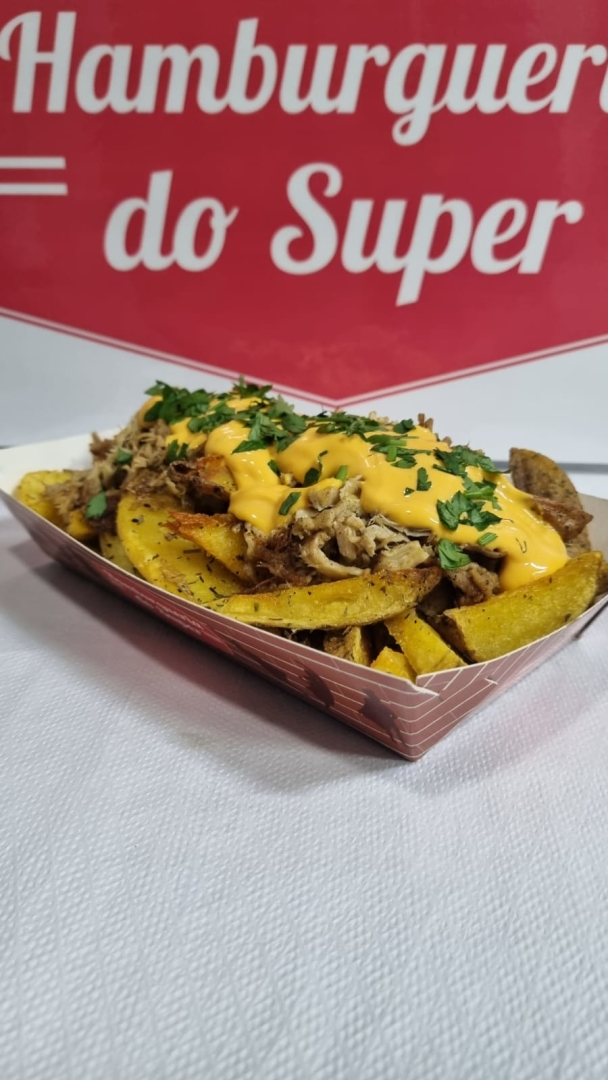 Nossa já tradicional e exclusiva Fritas do Super cobertas com carne de porco defumada e desfiada, bacon, molho de cheddar e rodelas de pimenta jalapeõ. Porção de aprox 450g. Acompanha maionese da casa