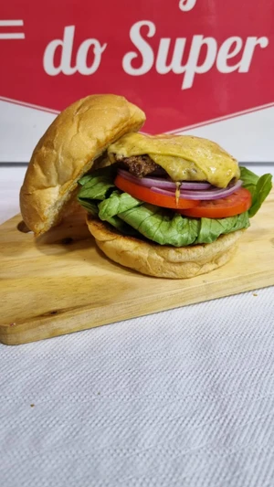 Burger artesanal de 100g, queijo prato, alface, tomate e cebola roxa. Acompanha maionese da casa.