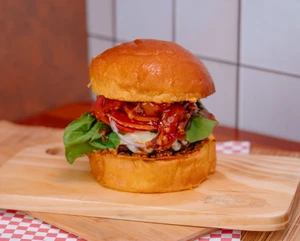 Burger Artesanal de 170g, mussarela de búfala, bacon, cebola crocante, rucula, tomate, cebola roxa e molho sweet chilli no pão de brioche. Acompanha maionese da casa
