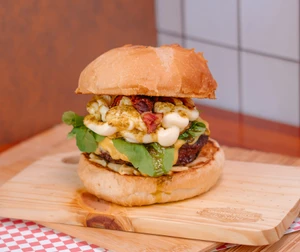 Burger artesanal de 170g, queijo coalho tostado, bacon, tomate seco, rúcula e molho honey mustard no pão australiano da casa. Acompanha maionese da casa