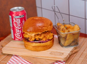 Burger Artesanal de 170g, Pimento Cheese, Bacon, Cebola Crocante, Cebola Roxa, Picles e molho Chipotle no pão de brioche. (Pimento Cheese é uma mistura de queijos cremosos, pimenta jalapeño, pimentão e maionese) Mais Bebida e Porção individual a sua escolha. Acompanha maionese da casa