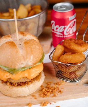 Burger artesanal empanado de mandioquinha com grão de bico, cheddar vegano, cebola crocante, alface, tomate, cebola roxa e molho chimichurri no pão de hamburguer francês. Escolha sua bebida e sua porção individual